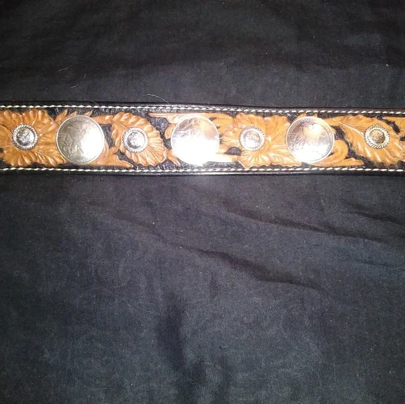 You've never seen a belt as beautiful as this one. It is an authentic Native American item and is worth several thousand dollars due to the genuine abalone, black onyx, turquoise, and the fact that they are inlaid in hammered sterling silver. Vintage hammered silver Navajo Indian Chief with headdress belt buckle with genuine gemstones and genuine two-tone brown and black leather belt adorned with pieces of genuine black leather cut into gorgeous leaves. The leaves themselves are intricately detailed to show every part of a living leaf, from the vein going down the center of the leaf to the smaller veins throughout the entire leaf. I promise you are looking at not just any old belt but...a work of art listed here for far less than it's worth. This belt is so gorgeous it's fit to be displayed hanging on a wall.